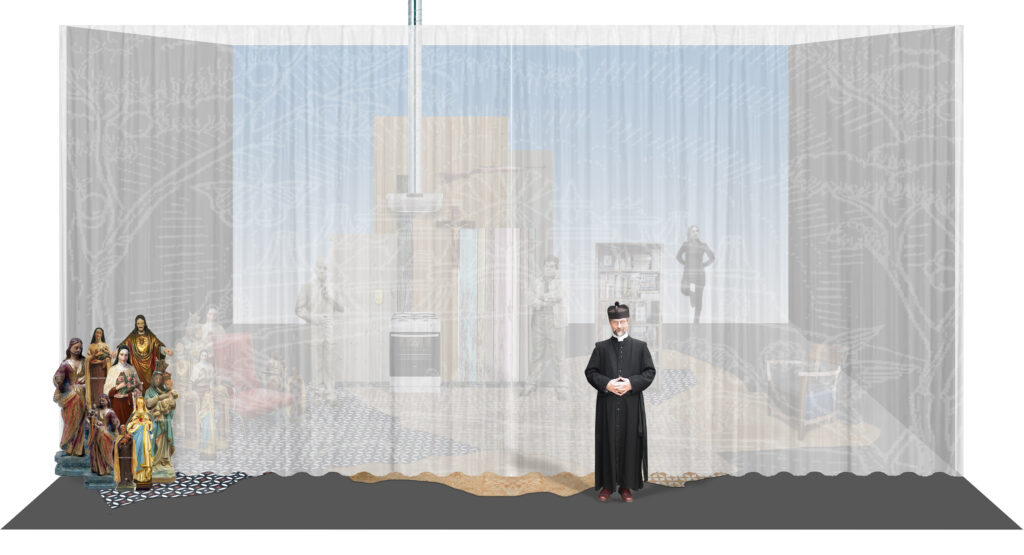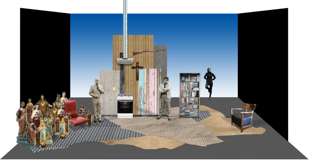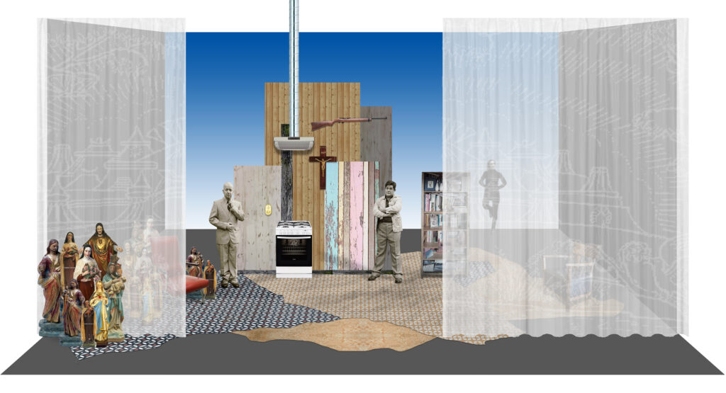 Voor deze eerste productie, in het roeselaars, maken we de kostumering en het decor, zowel het ontwerp als de uitvoering. We blijven dichtbij de realiteit, en toch weer niet…